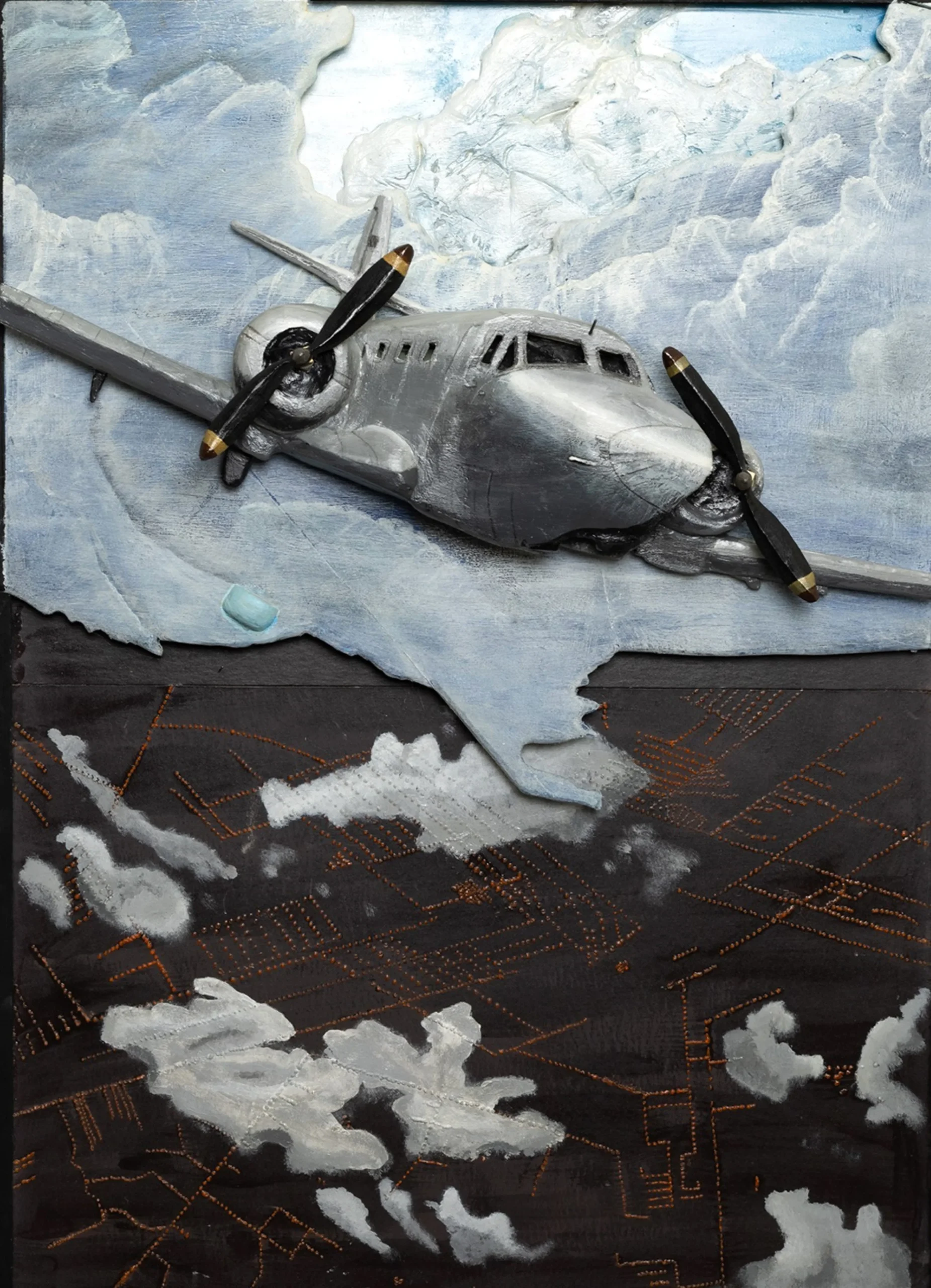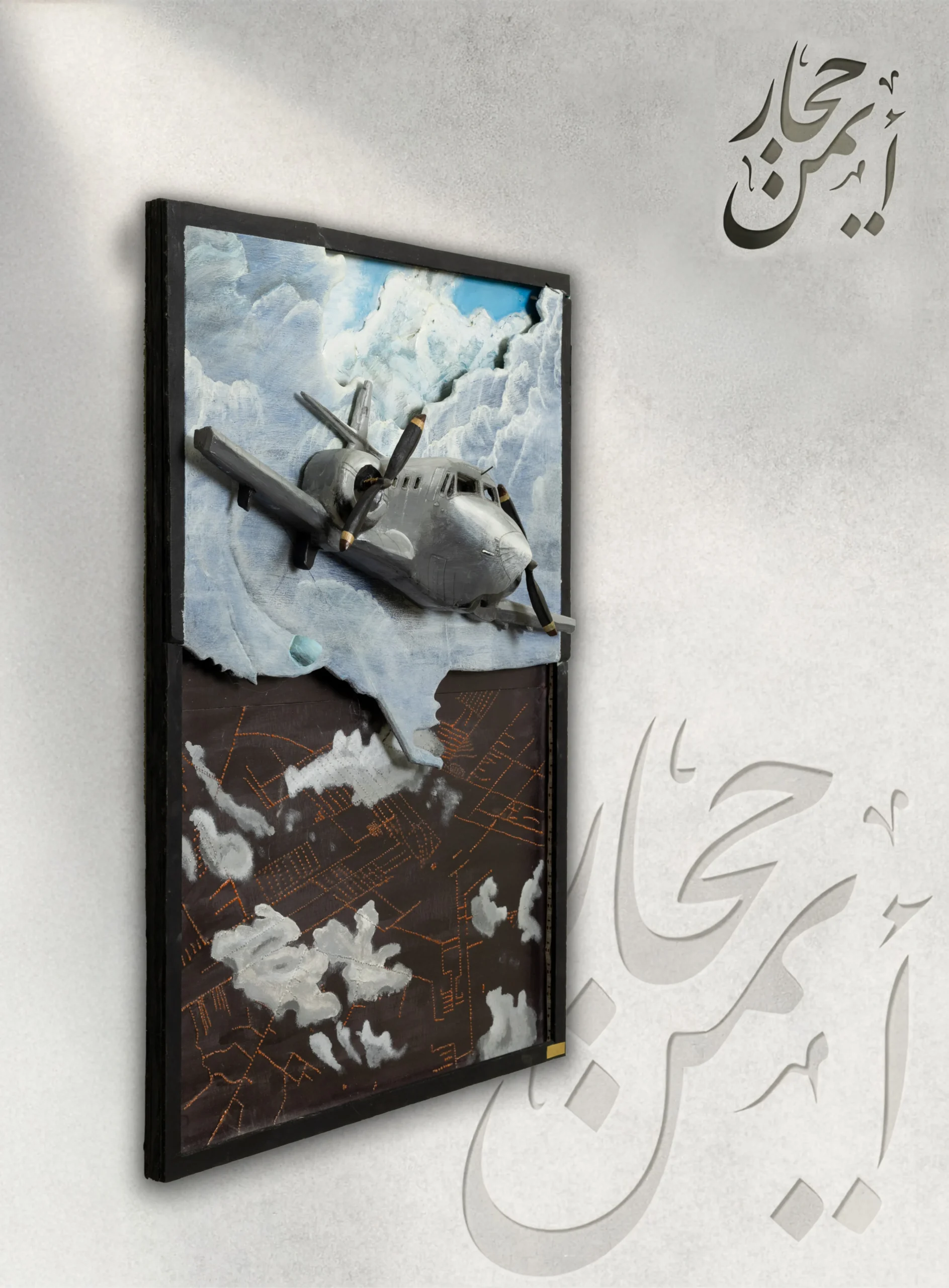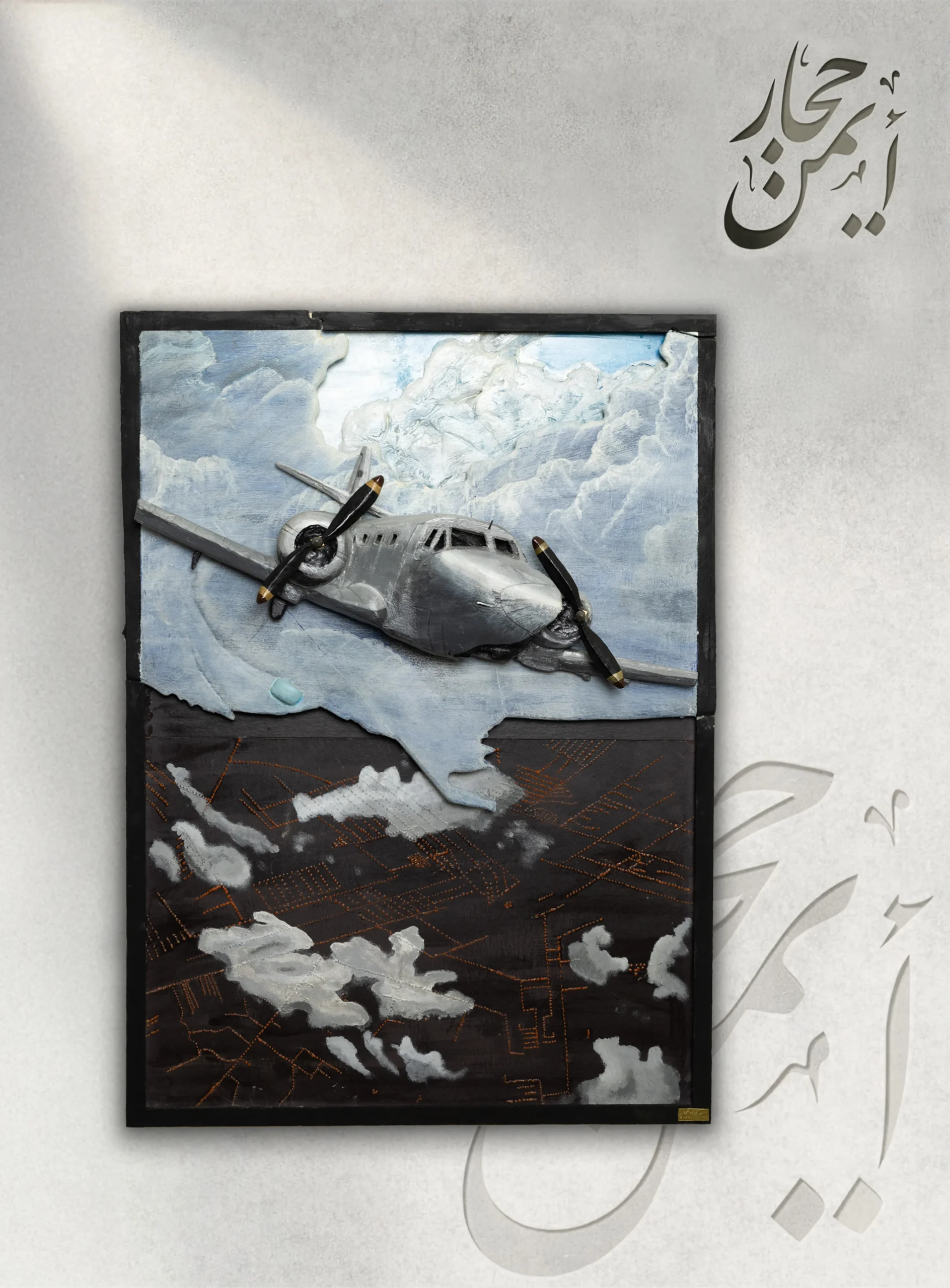 لوحة لطائرة تحلّق فوق السحب، بينما تظهر المدينة في الأسفل كأنوار صغيرة بعيدة، في إحساس بالرحابة والعلو.
