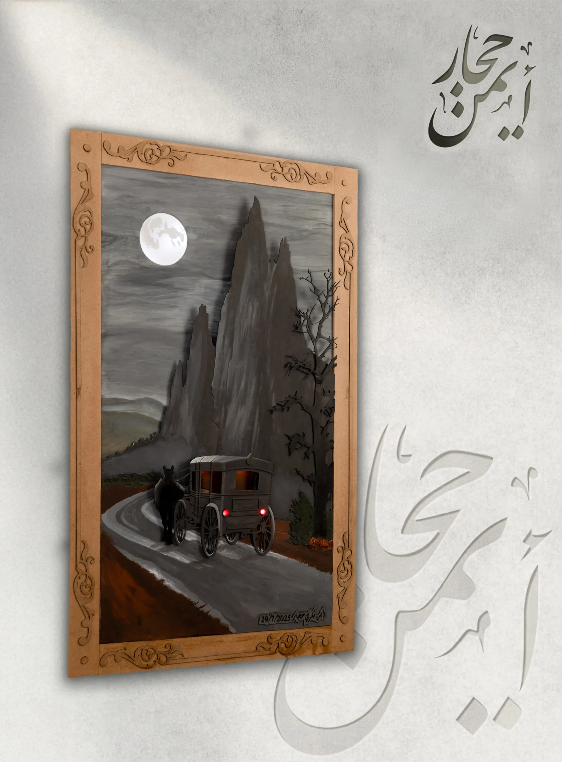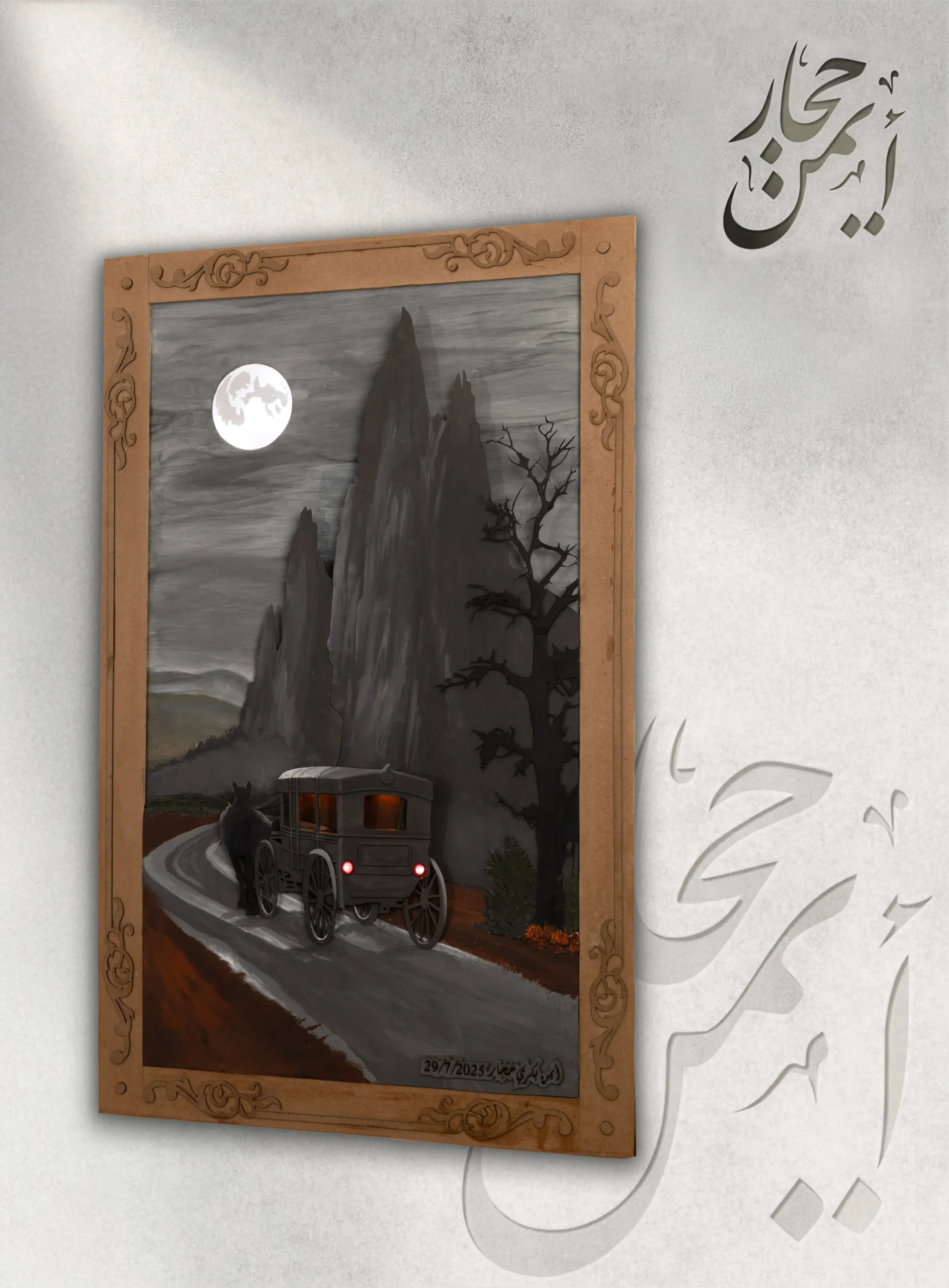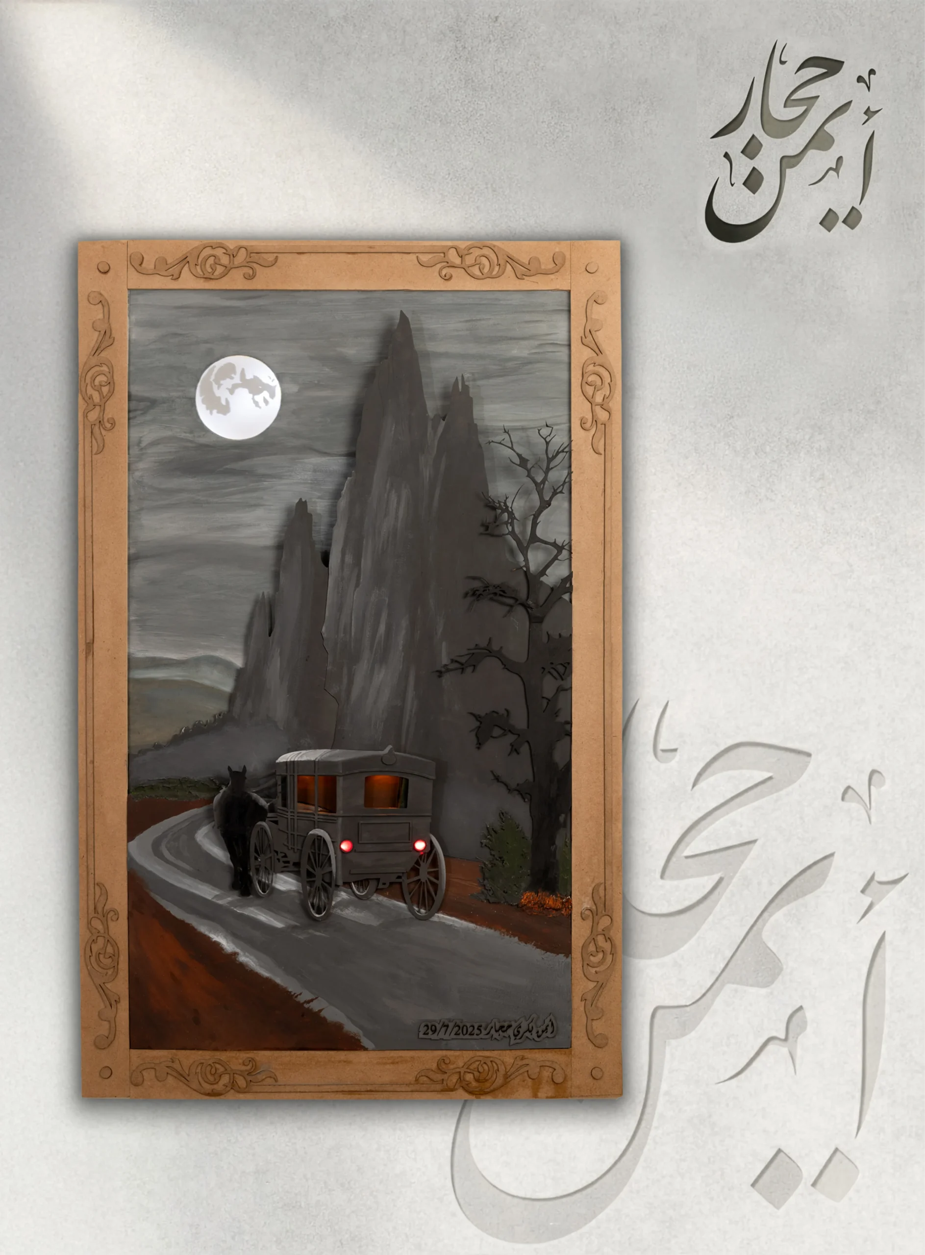 لوحة لعربة تجرّها حصان في ليلة مظلمة تحت ضوء القمر، محاطة بالجبال، تعبّر عن رحلة هادئة في طريق غامض.